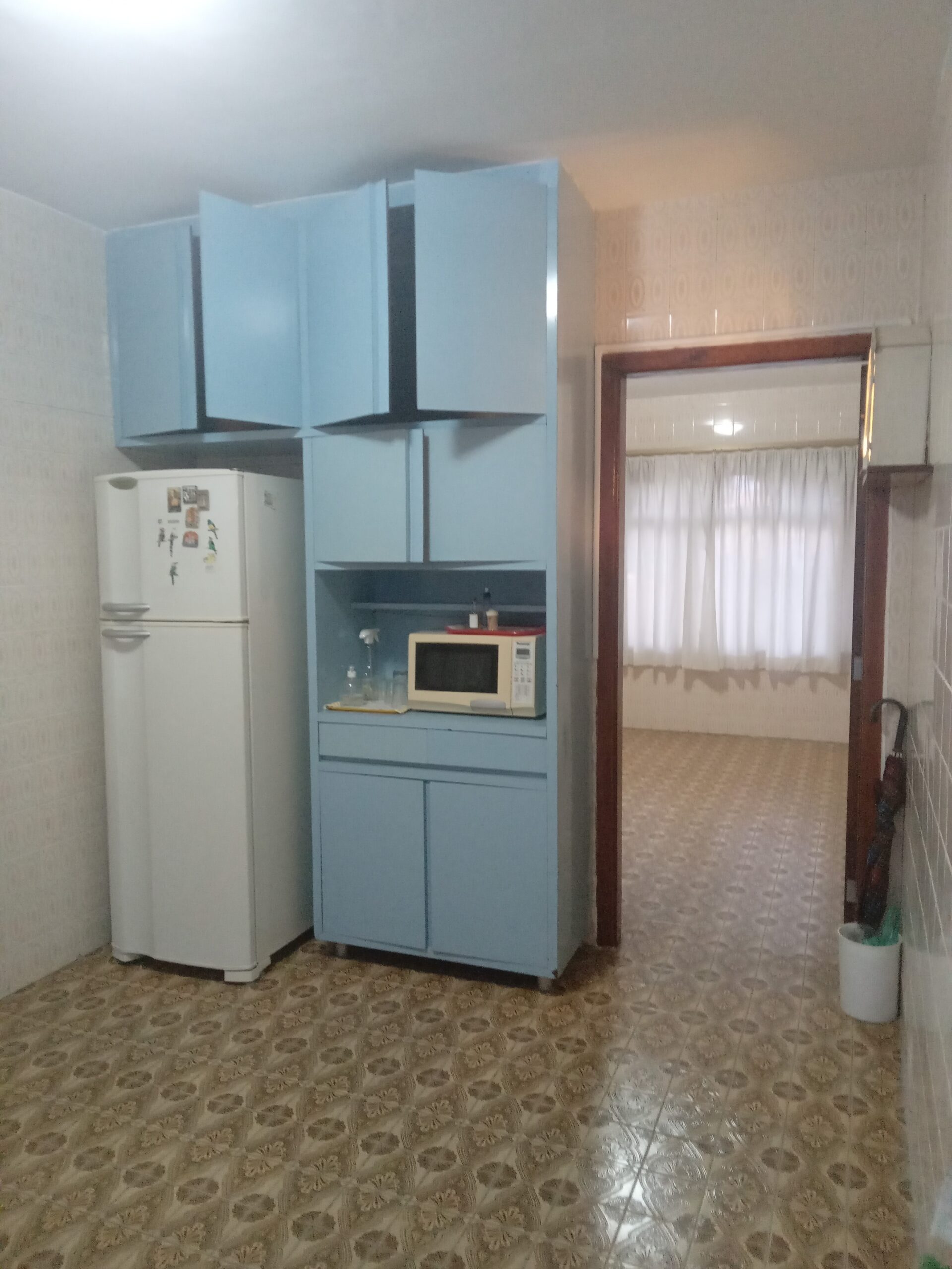 3) cozinha azulejada até o teto piso cerâmica tem geladeira , filtro e microondas disponíveis e armário embutido em uma parede e embaixo da pia com que tem 2 cubas